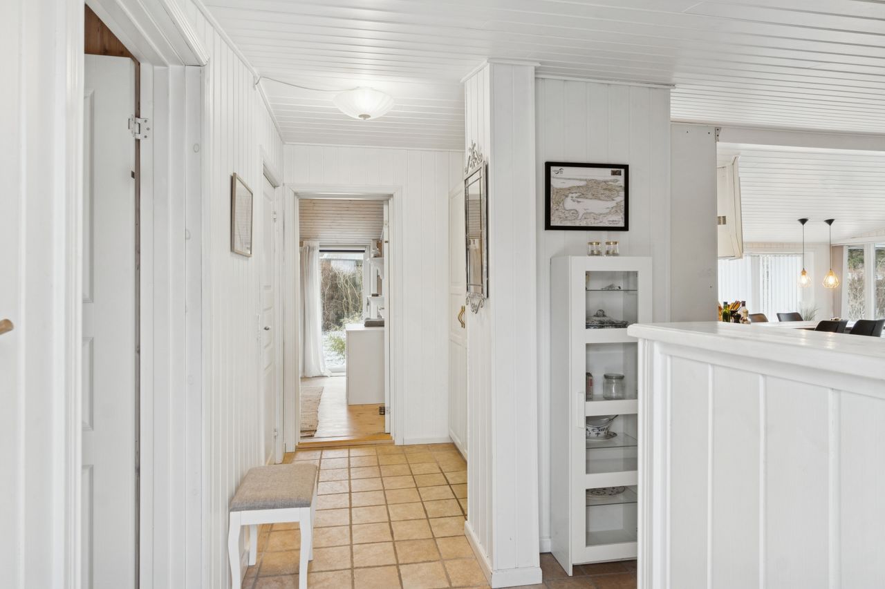 Derudover rummer huset et funktionelt bryggers med vaskemaskine og god opbevaringsplads. Dejligt soveværelse med direkte udgang til haven samt to gode gæsteværelser med udtrækssenge. Badeværelset er opført i klinker, har gulvvarme og fremstår pænt og tidssvarende.
