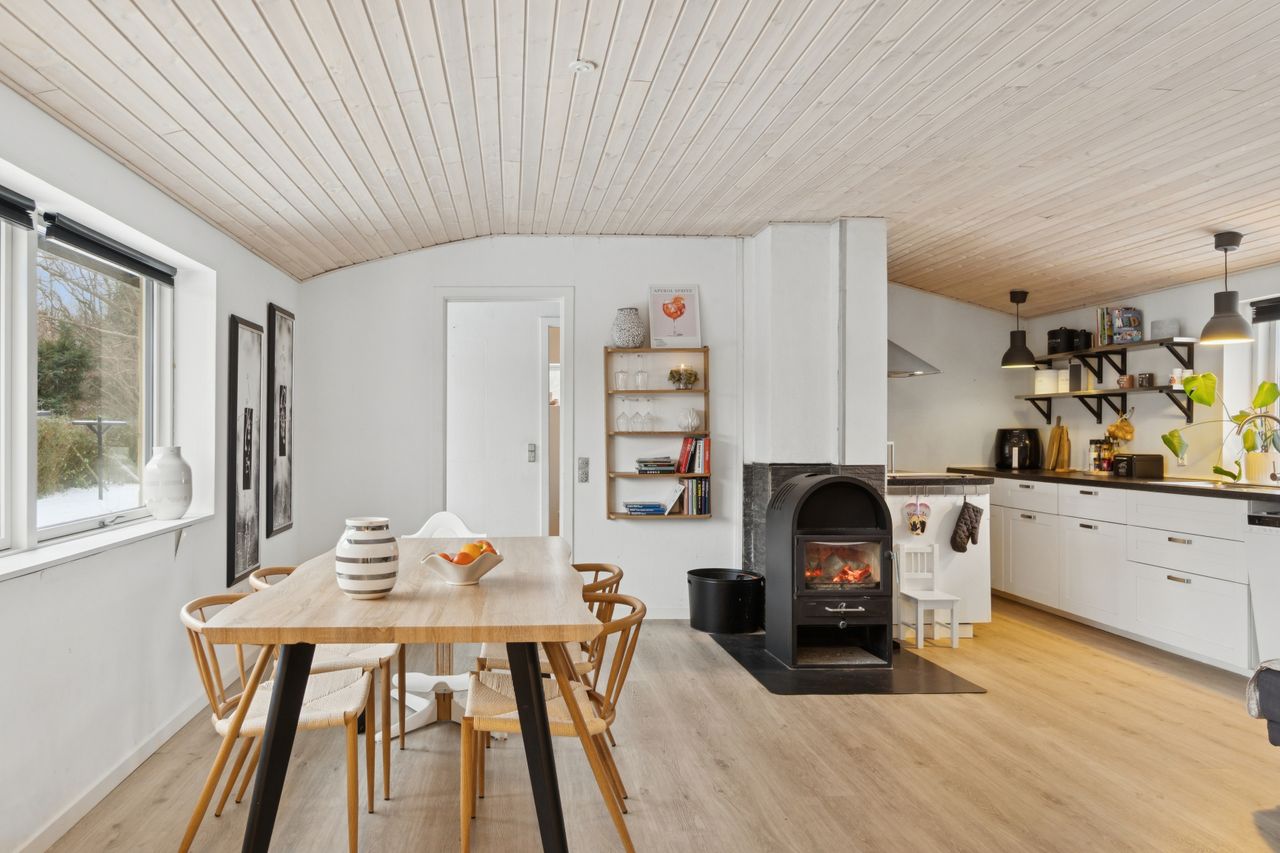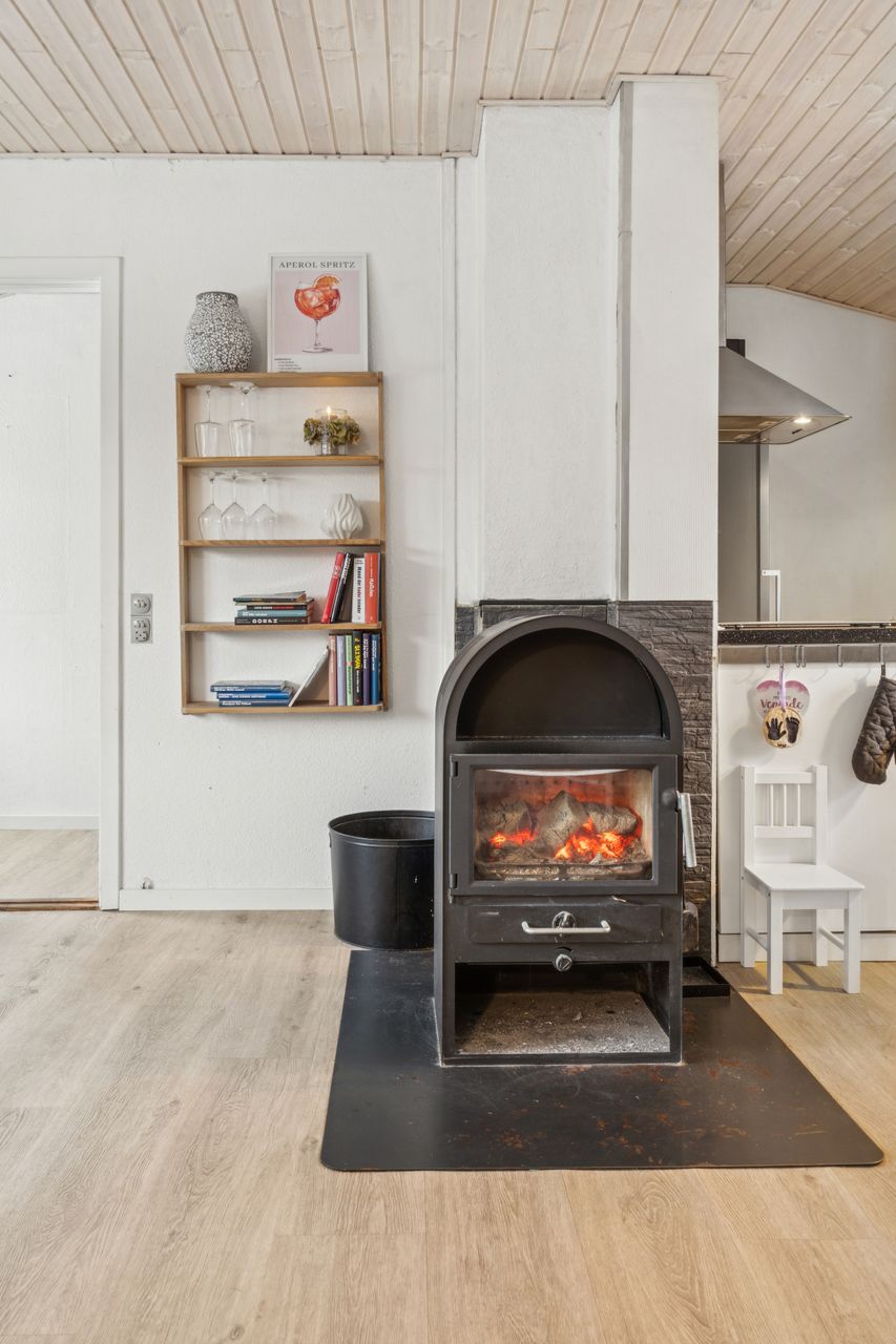 Boligen er pænt opdateret og byder på to gode værelser samt et funktionelt walk-in closet, der giver rig mulighed for opbevaring. Badeværelset fremstår lyst og praktisk, og husets hjerte er det åbne køkken-alrum i forbindelse med stuen, som skaber en indbydende ramme for både hverdag og samvær. Køkkenet der har hvide moduler og masser af skabsplads er kun 10 år gammelt. Gulve og lofter er renoveret i 2024. Huset opvarmes af praktisk varmepumpe og hyggelig brændeovn.